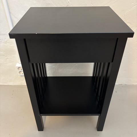 IKEA sängbord med en låda och en hylla under. Möbeln är vit och har en enkel design som passar vid sidan av sängen för förvaring av mindre föremål.