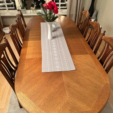 Snyggt och rejält ekbord med fyra tillhörande klädda stolar. Inköpt i början av år 2000 från inredningsbutiken Silo i Skövde.