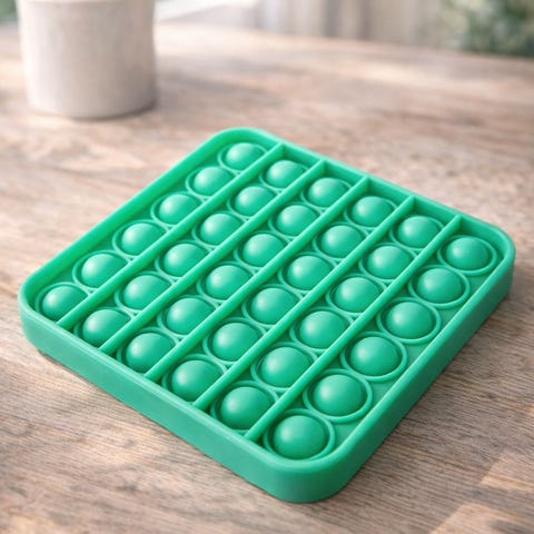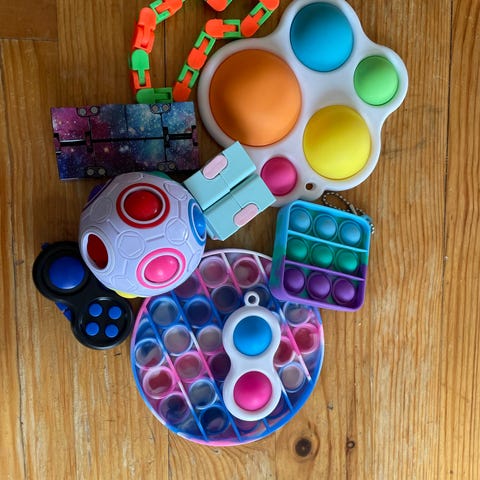 Ingår en cirkel-pop-it,4 airhead NeeDoh, pommes pop-it, en snögubbe pop-it och en jättelång rosa pop-tube.
