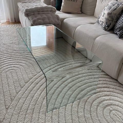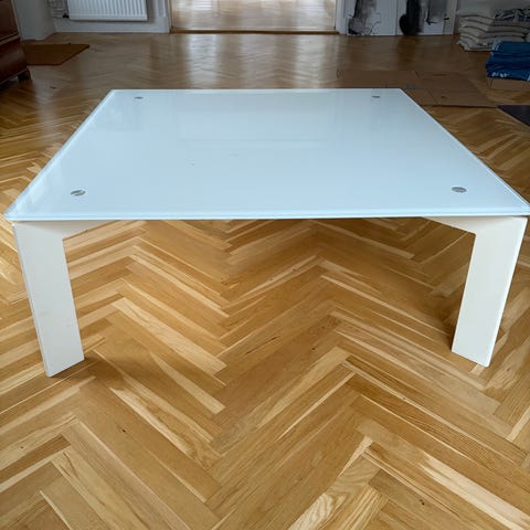 Mio Aage Petersen soffbord med bordsskiva i glas och ben i trä. Bordet har en modern design och är lämpligt för vardagsrum. Mått: 105 cm i längd.