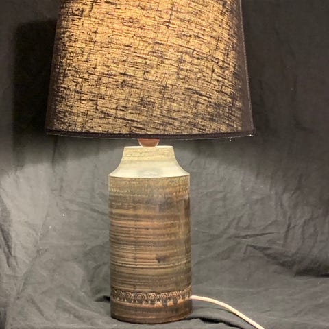 Bordslampa i glaserat stengods av Carl-Harry Stålhane för Rörstrand. Liten nagg vid etikett och missfärgning, var god se bilder. Sockel trasig vilket gör skärmen ostadig.