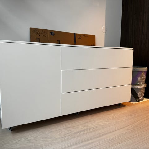 Arctic sideboard/TV-bänk från Voice i klassisk stilren design, vit med top i valnöt. Design: Rolf Fransson.