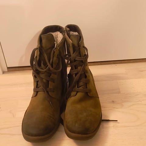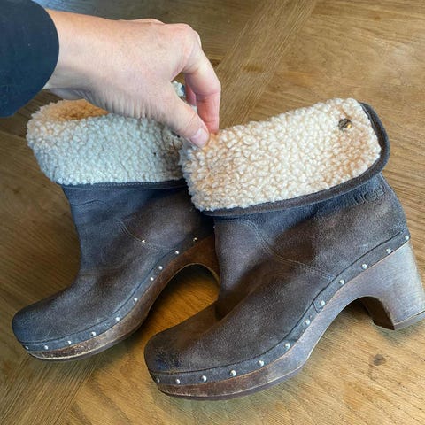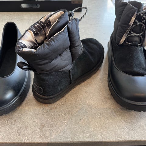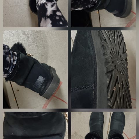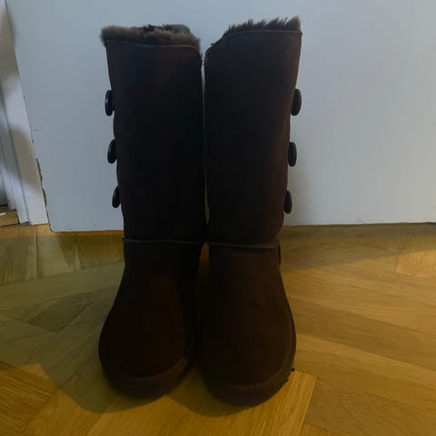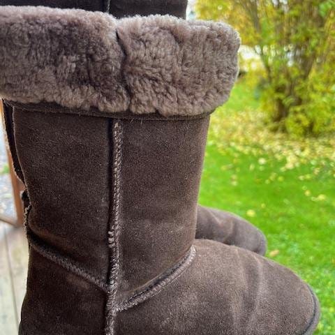UGG tofflor i storlek 40 med brunt yttre och dekoration i rött och vitt runt kanten. Tofflorna är tillverkade i mocka med en mjuk och varm insida, lämpade för inomhusbruk. Högra skon har något mörker mocka jag råkade använda en impregnering som var mörkare. Se bild.