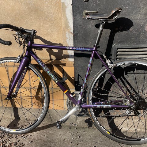 En superfin klassisk racer som jag både kört med slicks och clips men nu haft som transportcykel. Finns clips som följer med men vanliga trampor är på nu. Sigman funkar men behöver bara nytt batteri då jag inte använt den på ett tag. Byt en vevarm men annars allt original. Passar för någon runt 175 till och från