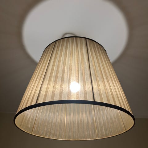 Lampan har en mjukt, rosa tygskärm.