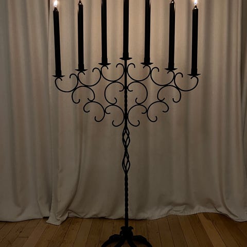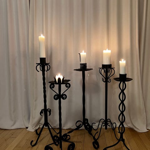 Unika smidda ljusstakar i svart metall med integrerad vinhållare.