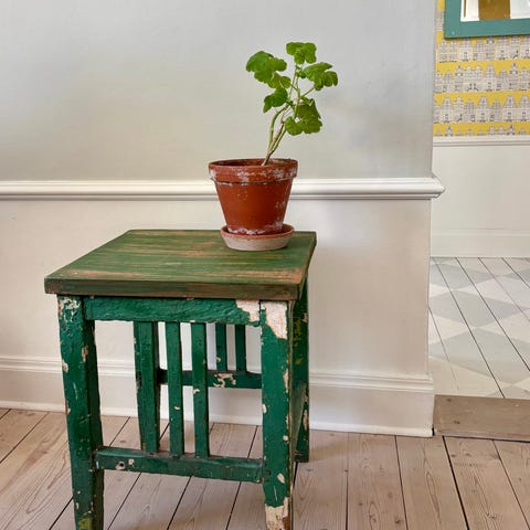 Denna Ikea pall är målad och du finner inte en likadan så långt ögat kan nå. Översidan är färgat skinn med läderband runt om. Trappsteget är inklätt i fuskpäls. Färg: akryl med klarlack för att försegla.