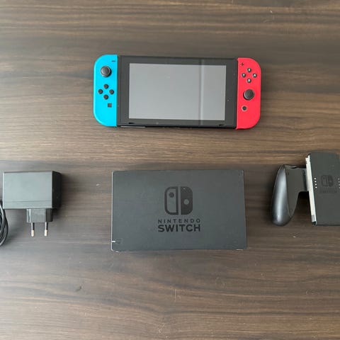 Nintendo Switch OLED spelkonsol i vitt utförande. Inkluderar konsol, dockningsstation, handkontroller, laddare och bärväska. Passar för spel på TV och som bärbar enhet.