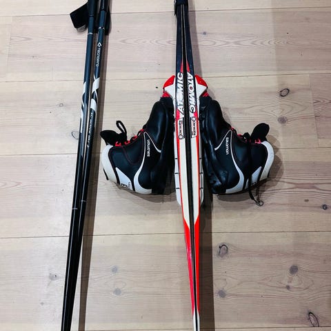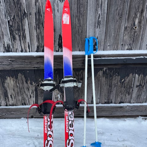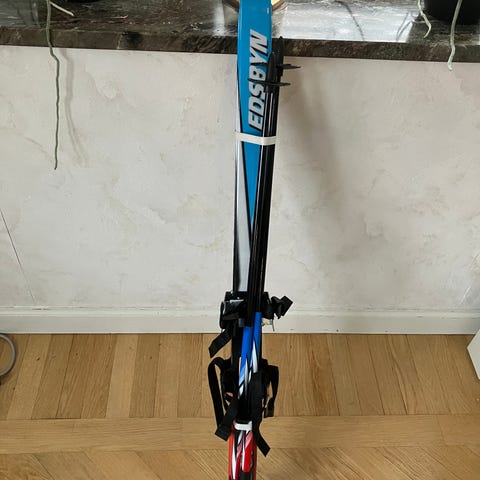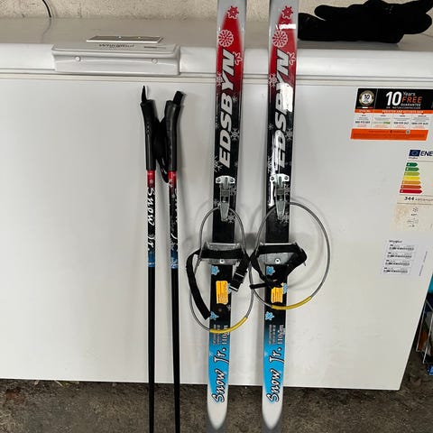 Ett barnskidset som innehåller ett par bra längdskidor och stavar från Edsbyn. Skidorna har en enkel och pålitlig universalbindning för skor, 110 cm och är vallningsfria. Stavarna är 85, allt i bra skick.
