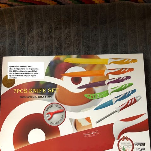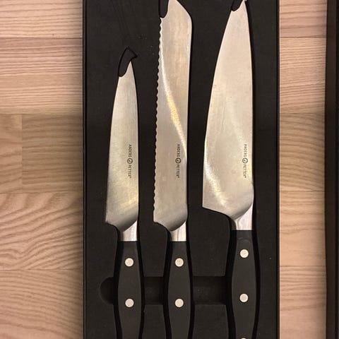Märket är lite cheesy och heter Jean Patrique och modellen heter Master Gourmet. För övrigt skyssta knivar men behöver nog slipas.