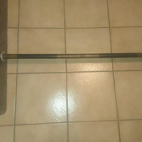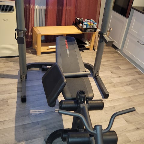 Skivstång bredd 120 cm, hylsdiameter 25 mm, grepp 31 mm. Väger ca: 28 kg med vikterna på.