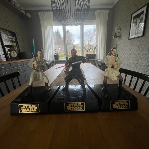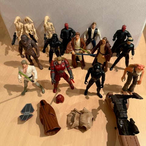 Star Wars figurer i olika storlekar som är sparsamt använda och i fint skick inga synliga märken eller defekter.