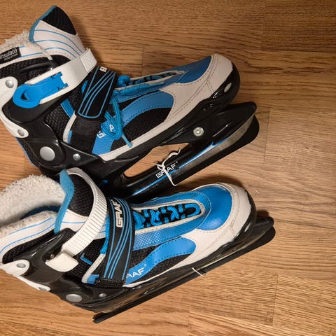 Ställbara skridskor storlek 32-37. Lätt att justera storleken. Använda vid ett fåtal tillfällen.