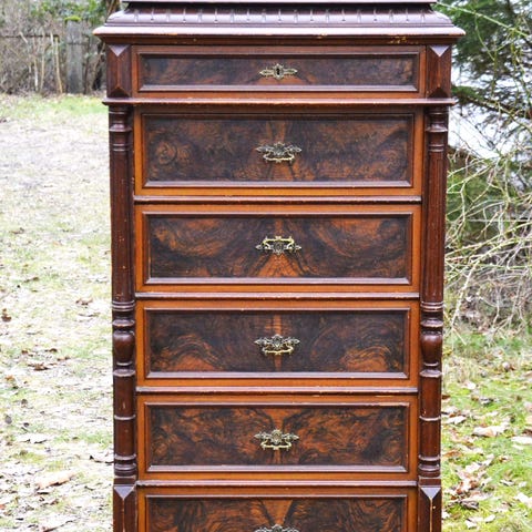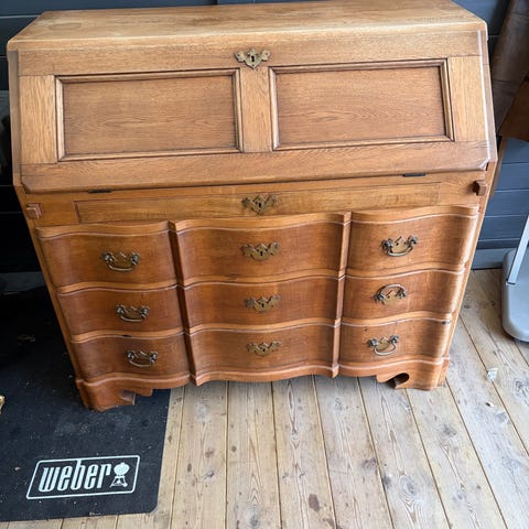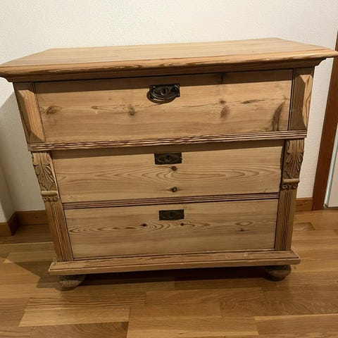 Antik träbyrå med flera lådor och öppna fack. Möblerad med metallhandtag och sliten yta som visar tecken på ålder och användning. Passar för förvaring av mindre föremål och kan användas som dekorativ möbel.