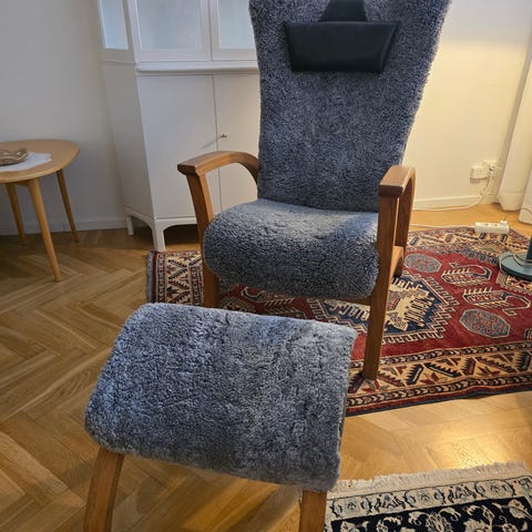Två Bröderna Anderssons fåtöljer med en fotpall