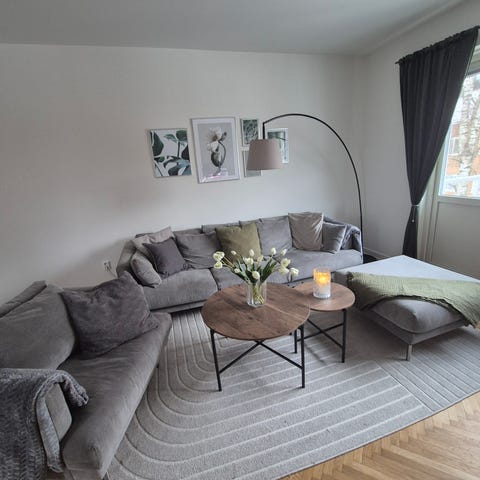 elegant soffa, let att städa rummet pga hjulen som har på så man kan snurra soffan vid behov