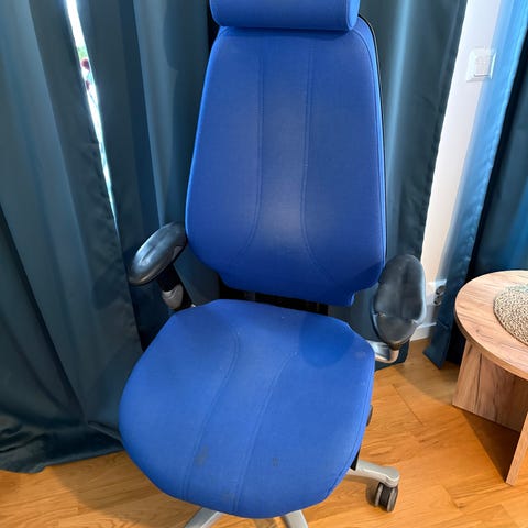 IKEA skrivbord i vitt med två lådor. Kontorsstol i svart med hjul, justerbar höjd och stoppad sits och ryggstöd i konstläder. Skrivbordet har en kabelgenomföring på ovansidan för hantering av sladdar. Skrivbordet har några märken men inget som syns tydligt. Stolen är i använt skick.