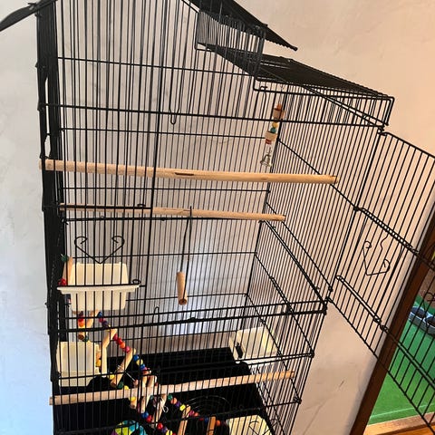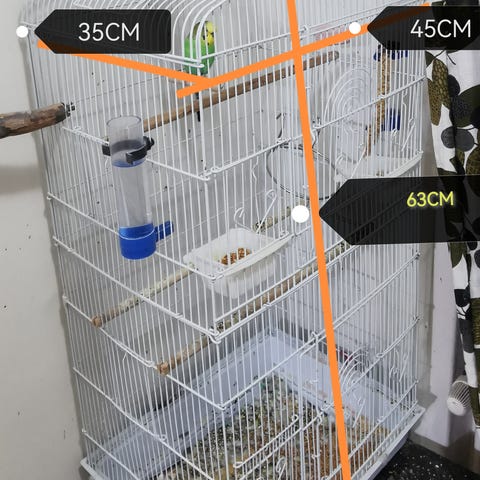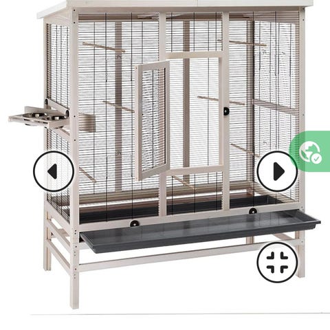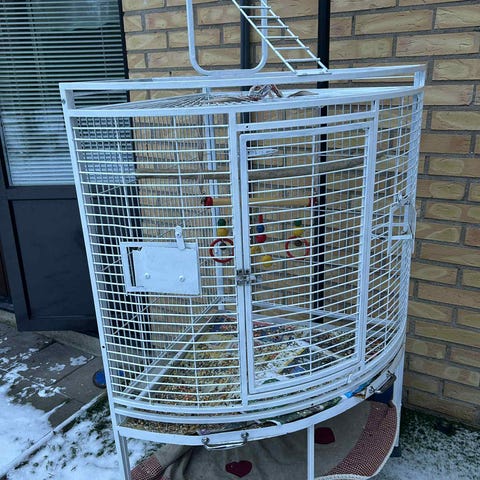 Träfågelbur med metallgaller och handtag