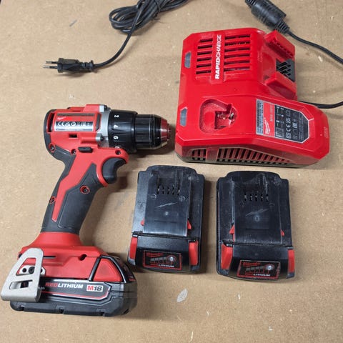 Milwaukee M18 FPD3 slagborrmaskin med 18V batteri (8.0 Ah REDLITHIUM) i röd och svart färg. Maskinen är utrustad med ett sidogrepp för bättre kontroll vid borrning och slagborrning. inkluderar rapid charger som laddar 2 batterier samtidigt