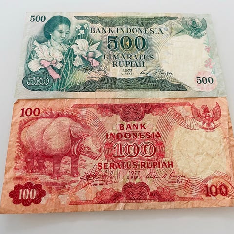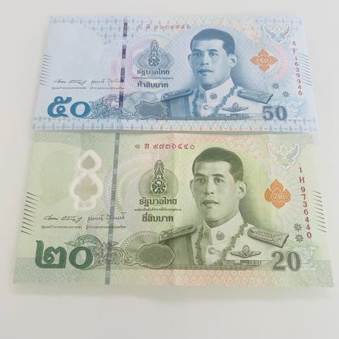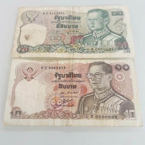 Två thailändska sedlar med valören 20 baht. Sedlarna har olika design och färgsättning, med porträtt av thailändska kungligheter. Används som valuta i Thailand.