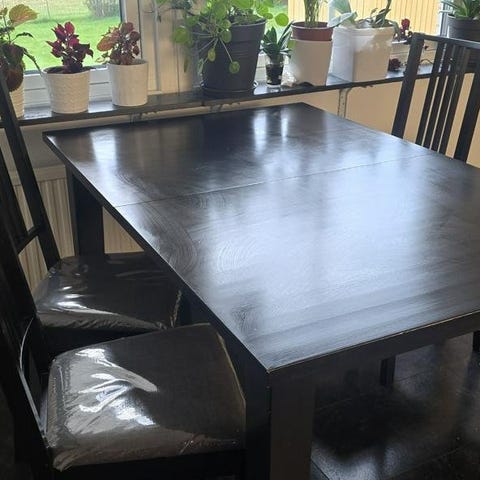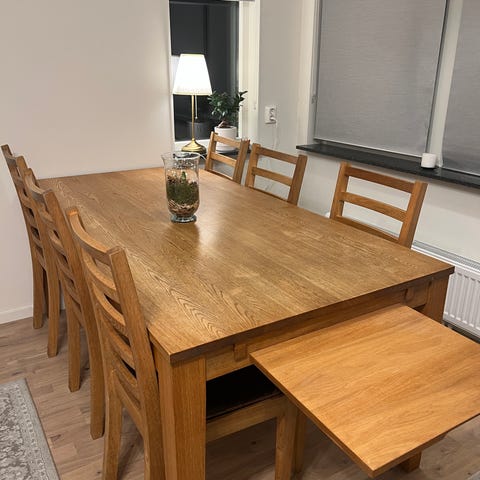 Matbordet kan man förlänga och är väldigt tung
