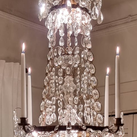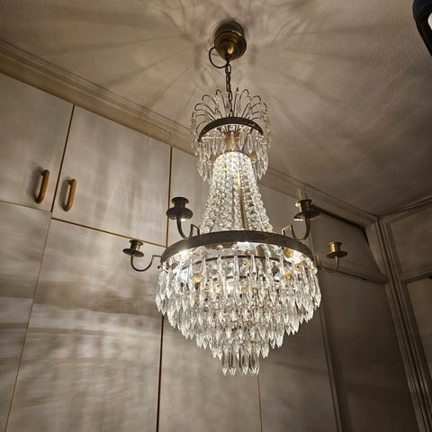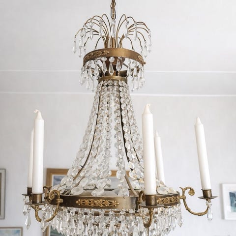 En fint äkta, mässing , empire stil kristallkrona som är rengört nyligen .