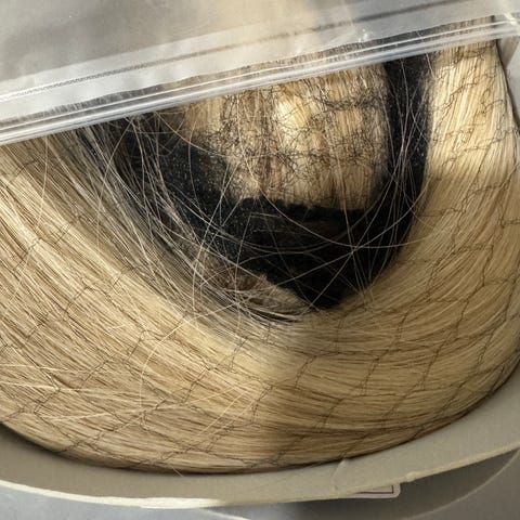 Blond syntetiskt hår. Håret är väldigt rakt och mjukt även om du rörde på dig. Jag satte ett väldigt billigt pris för det.