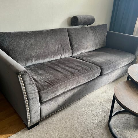 EM Home Estelle Chill 3,5-sits soffa i svart tyg med svarta ben. Soffan har en stomme av massivt trä och sittplymåer av kallskum och silikonfibrer med fjädrar, vilket ger stöd och komfort. Ryggplymåerna är stoppade med silikonfibrer och fjädrar och är vändbara. Soffan är 267 cm bred, 113 cm djup och 90 cm hög.