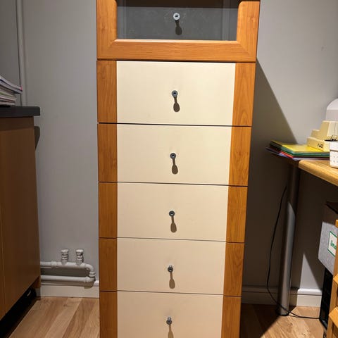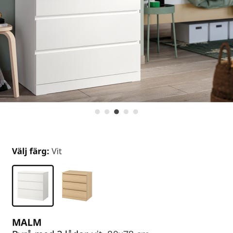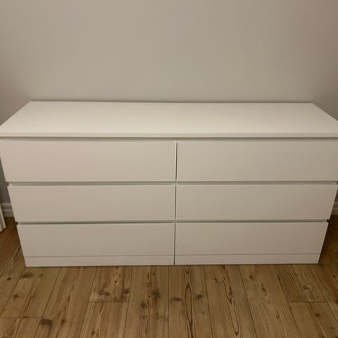 Vit byrå med fem utdragbara lådor från IKEA (modell KULLEN, nypris 995 kr). Väl använd men väl omhändertagen och i fint skick, endast några små ytliga skavanker i bakre övre kanten (se bild).