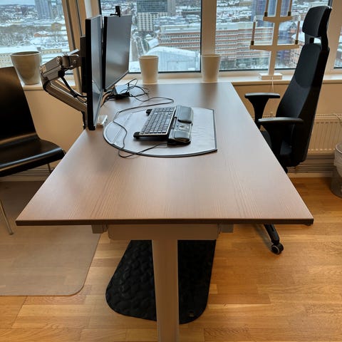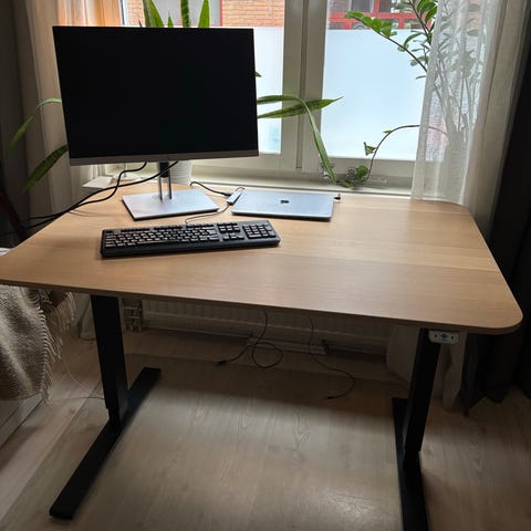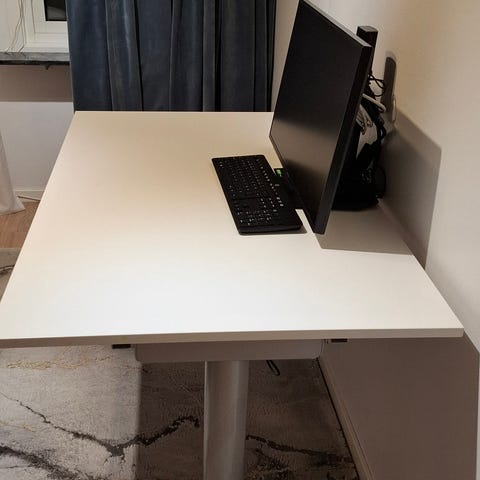 Höj- och sänkbart skrivbord från Rusta, inköpt 2023 och i mycket gott skick. Använt väldigt sparsamt, mestadels stått oanvänt. Perfekt för små ytor, hemmakontor eller studentboende.