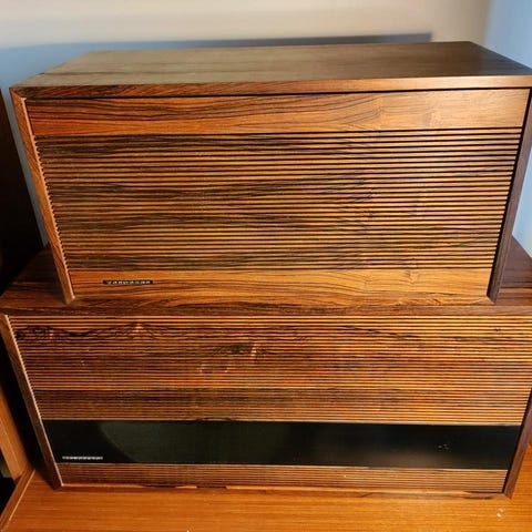 Troligen från 60-talet eller 70-talet, med vad jag gissar är teakfaner, det finns lite skavanker på dem, men jag överlåter till en eventuell framtida ägare att fixa dem. Det mest synliga är att den ena har några små skador på framsidan, men de kan nog döljas med lite färg i passande kulör. Tandberg-emblemet på den andra är lite böjt, men det kan säkert rätas upp. Båda har några skador på kanterna, jag tror mig ha fått med de flesta på bilderna, så kolla på dessa för att bilda dig en egen uppfattning om skicket. Jag tycker skadorna ser värre ut på bilderna än i verkligheten, då man normalt sett inte ser dem alls då de är på de bakre delarna eller ses på avstånd. Båda högtalarna går att få ljud ifrån, men jag kan inte bedömma om det är identiskt från båda.