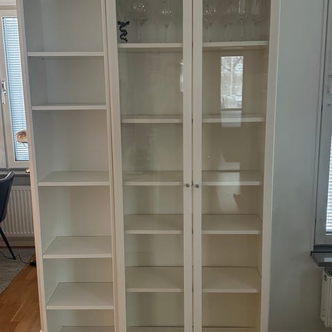Vit Billy bokhylla med Oxberg dörr och överskåp. Har täckt för hålen för hyllplanen med dekorplast för en snyggare finish, går enkelt att riva av.