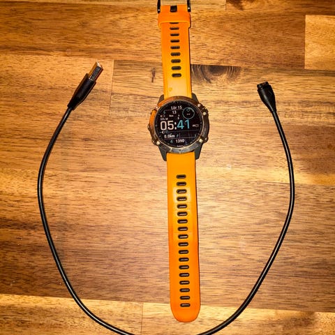 Garmin Fenix 7X GPS-klocka i svart färg. Klockan har ett svart armband i bra men använt skick samt ett extra svart armband (helt nytt) och en laddningskabel.