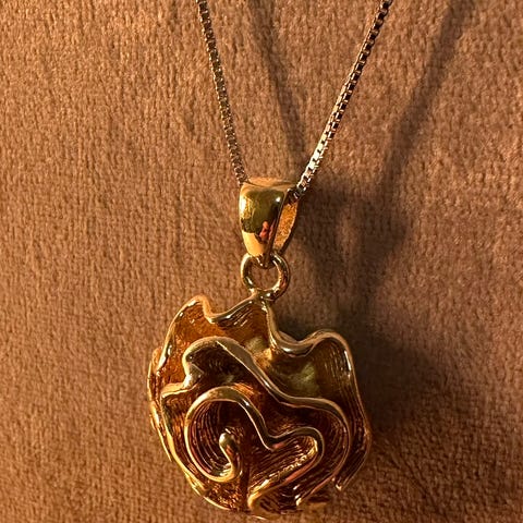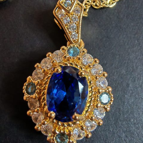 Ett vackert halsband med ett hänge i form av en droppe. Hänget är prytt med gnistrande stenar. Den stora stenen har orange färg och Den stora stenen har orange färg och med stor sannolikhet är citrin och de små stenarna är kubik zirkon. Hänget är märkt med 18 K GP Kedjan är stämplad 925. Mått hänge 3*1,5cm. Kedja 46 cm.