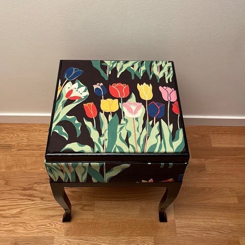 Vintage Stor Teak Pall med Förvaring Tyg Gröna Fåglar Josef Frank Svenskt Tenn