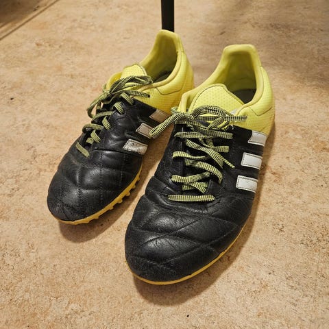 Adidas Sala fotbollsskor i storlek 44, svarta med vita detaljer. Skorna är anpassade för inomhusfotboll och har en yttersula som ger bra grepp på inomhusunderlag.