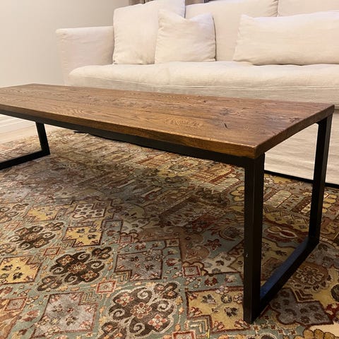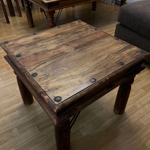 Säljer ett rejält och snyggt soffbord i massivt trä med mycket karaktär. Bordet har vackra naturliga färgskiftningar och är utsmyckat med dekorativa svarta metallbeslag för en rustik/industriell känsla.