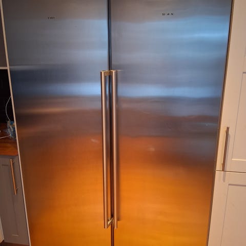 Bosch Kombiskåp i rostfritt stål. Kyl- och frysskåp med flera hyllor och lådor för förvaring. Använt skick (se bilder) men fullt fungerande.