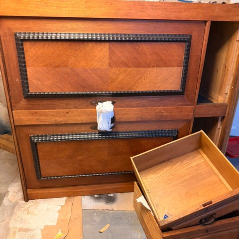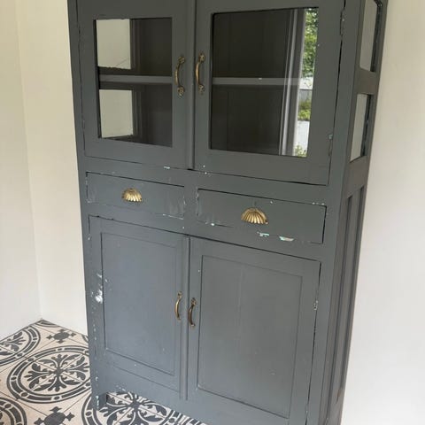 Kinesiskt antikt skåp i trä med två dörrar och metallbeslag. Skåpet har en mörkbrun finish och inuti finns hyllor och lådor för förvaring. Passar för användning som förvaringsmöbel i hem eller butik.