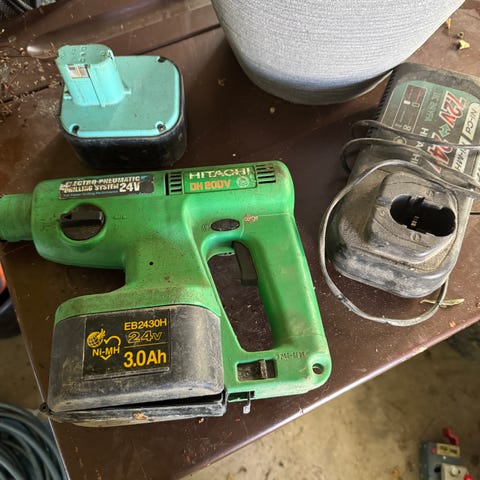 Hitacielektrisk borrmaskin i grön färg. Verktyget är avsett för borrning och har en elektrisk drivning med sladdanslutning.