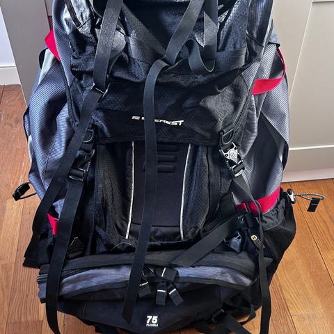 Everest 65 L ryggsäck i färgerna lila och svart. Ryggsäcken har en kapacitet på 65 liter och flera fack med dragkedja. Den är utrustad med justerbara remmar och vadderade axelband för bärkomfort.