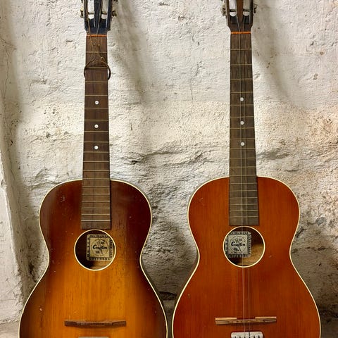 Walden Halvakustisk baritongitarr med inbyggd Fishman-elektronik med grafisk equalizer. Endpins är utbytta mot nya från Graphtech.