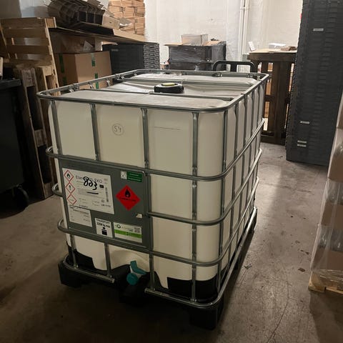 Har ett gäng IBC på 600, likt de på bild. Har tidigare varit sockerbaserade saker i, såsom sirap eller liknande i, spolas enkelt rent med vatten!