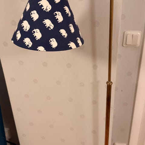 2 vackra sänglampor med identiska fötter i mässing och glas, totalrenoverad el med jordad kontakt och nya strömbrytare. Skärmarna i superskick klädda i Svenskt Tenn/Josef Franks mönster Anakreon, väldigt fina kompletterande utsnitt ur mönsterrapporten.