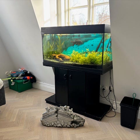 Botten är mycket repig, det finns lite repor på alla glasen, mest nedtill. När akvariumet är fyllt ser man dem inte så väl. Silikonet är fortfarande elastiskt och i bra skick. Det medföljande filtret är bortskuret från glaset. Lysrören är ca 2 år gamla. Akvariumet är inhandlat år 2020. Akvariumet håller tätt. Det saknas ett litet plastlock på luckan på toppen av akvariumet. Pumpen fungerar bra, den har inte använts de senaste 3 åren.