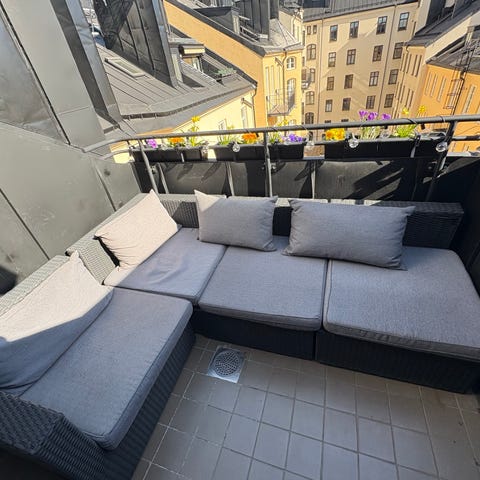 Utemöbelset bestående av hörnsoffa och bord i grått material. Soffan har dynor för sittkomfort och bordet har en slät yta. Passar för utomhusbruk på balkong eller terrass.