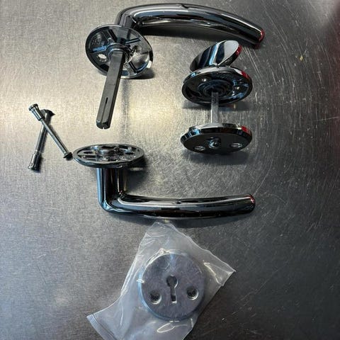 ASSA Entré K1 låssats komplett med låshus 2002 med hakregel, säkerhetsstolpe 1487-2, 12 dubbelcylindrar 1212 med 5 nycklar, cylinderlåsbehör 3212, vredskytt 4356, handtag 1956 Epok, 2 förlängningsdelar, 24 mm borrning, skruv och tillbehör samt extra asymmetrisk stolpe. Helt nytt!