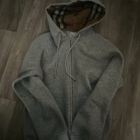 Burberry herrtröja i storlek XL, grå färg och tillverkad i bomull. Tröjan har huva med klassiskt Burberry-rutigt foder och dragkedja framtill. Kvitto/kontoutdrag finns. Köpt på Fashionesta.com för 512 euro. Fraktar men kan också mötas upp för smidig affär!