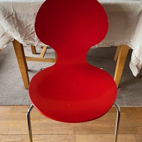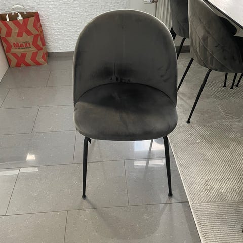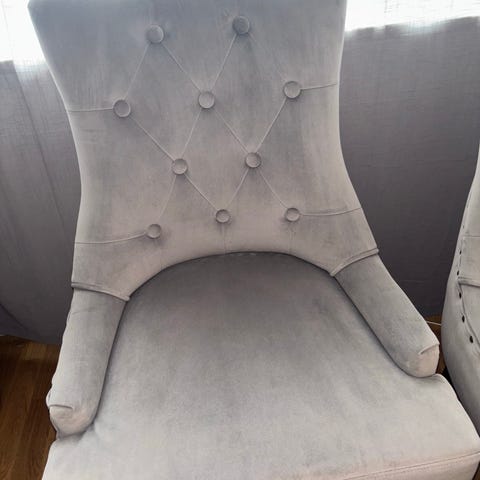 Mio Stol i beige tyg. Stolen har en stoppad sits och rygg med knappdetaljer. Passar för användning i matsal eller vardagsrum. Dessvärre har vissa stolar lite skönhetsfläckar av konstnärliga barn i form av permanent penna. Ringar saknas på ryggen, därav överkomligt pris vid snabb affär!