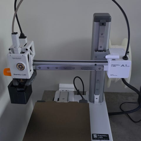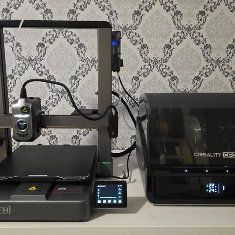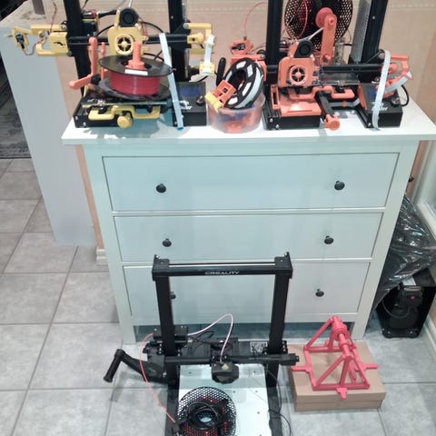 3D-skrivare i svart färg. Utrustad med öppen ram och filamenthållare ovanpå. Används för att skapa tredimensionella objekt genom lager-på-lager-utskrift.